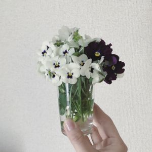 終わりかけだったので摘み取ったビオラたちをコップに生けました。