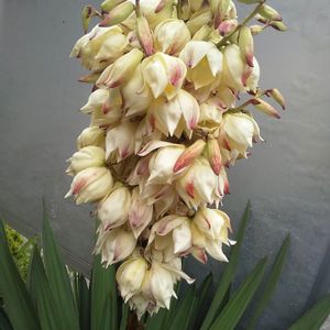 ユッカ🎵 ご近所さんシリーズ② 町内の掲示板の裏に 窮屈そうに咲いています。 咲くまでじっと我慢して見守って居ました😃