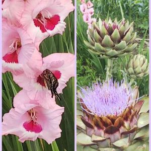 おはようございます☁ アーティチョークの花💜 大きいアザミのようです 花咲く前の蕾が食べられます、百合根の食感、トウモロコシのような味😋🍴 後ろのグラジオラスに蝶がいましたʚïɞ.•