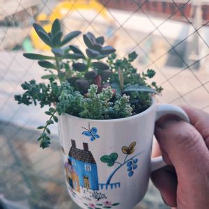 コーヒーカップに穴開けて作った鉢に多肉と今日のお花セダムの寄せ植え😅 レデボウリアは以前隣に置いていたので生えてきちゃった🤭 保護猫譲渡会あるそうです興味のある方はどうぞよろしく😃✌