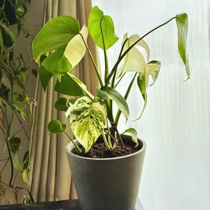 冬越し2 すべて部屋の中に移動させたつもりで外に出ると 植え替え途中の斑入りモンステラがありました かなり前に根元から剪定したものです 株分けして生き延びたモンズを1つの鉢にまとめました