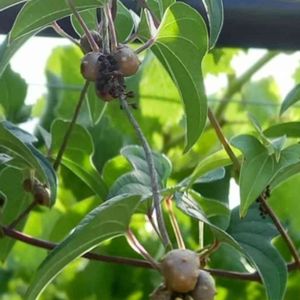 ヤマノイモのムカゴ ヤマイモ科ヤマイモ属つる性多年草 2週間振りの阿智の庭にヤマノイモのつるが絡まり、ムカゴがぶら下がってました😅 ジネンジョとも言われるとあり、自然薯と同じという事😲 田舎の庭は山の一部になってきています😅