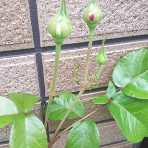 やっと 蕾が上がってきました🌹 フォーユアホームさん これまた蕾から開花までゆっくりのんびりの子。 はい、待ちますよ🎶