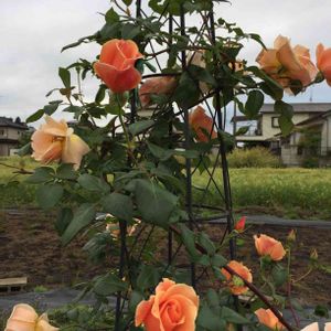 ロイヤルサンセット❤ オレンジが日が経つに連れて白くなっていくのが好きでなかなか花がらを詰めない…笑 つる性なので山椒の木に絡ませてます(´▽`)ノ