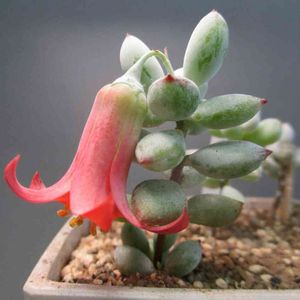 コチレドンにしては, 小粒のプリプリ対葉のペンデンス. この対葉の葉姿では,イメージできないほどの,大きな釣鐘型の紅い花が咲いた. いろいろ多肉の花を見てきたけど,見た目で支えられないとわかるほどのでかい花を咲かせるとは、ちょっとユーモラスにも見える.. もう少し,バランス考えてもよさそうだけど..