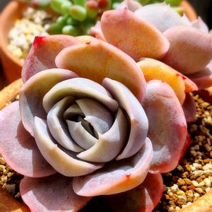 大好きな3種盛り ほんのり色ついて良き✨ 暖かくなりましたね 春の日差しは思ったより強い… 多肉棚の温度30℃超えて暑さに弱い種類にダメージが🥹 植え替えよりも配置変更と遮光を先にやっておけば…と後悔💧