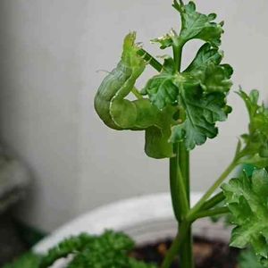 お料理にひと枝と…。 庭先の鉢植えのパセリが夏の暑さで弱り→🌱新たな新芽がみえていたのでそろそろ茂ってきたかなと出向いてみたら~ 茎や軸ばかりを目にする‼️😮 柔らかな新芽をしっかり食べられてしまった。無農薬で栽培はみな安心なのだ。 かなりの🐛太っちょっとさん.食欲旺盛である。 このままでは食材に困るのでそそと退散してもらいました。