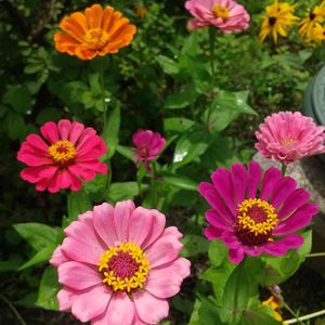 おはようございます☀ ジニア、いろいろ咲いています🏵️ 種まきした子とこぼれ種の子🎶 おまけでシオンが一つ❗ きれいだな🎶