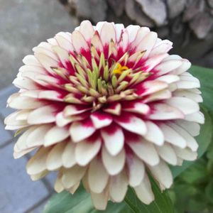 紅色と白の分量が絶妙。 縮緬細工のよう、美しい百日草。