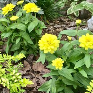 玄関前の花壇、今回は明るく爽やかにしたくてレモンイエローの花にしてみました。 思った以上にキレイです。 花の名前も葉っぱの名前も…忘れちゃった。 調べました。 「ジニア」みたいです。
