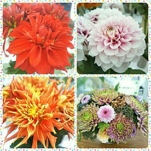 こんばんは。 今日は風が冷たい1日でした。 これも秋田県花の祭典のダリア達&右下菊の寄せ植え。 この菊、縁に色付いてるんですよ〜