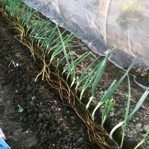 初めて苗作りから育てた中晩生玉ねぎ🎶 一昨日の写真ですが、根付いたようです✨ 向こうに見える畝はこの玉ねぎ約100本と交換した苺です💕 自分で苗を育てて、よその畑の方と物々交換するのもまた、家庭菜園の楽しみです(*´˘`*)♡