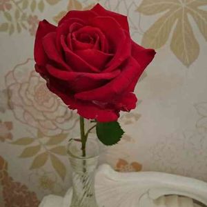 綺麗に咲き始めた ハイブリッドティーローズを 一本だけカットし 一輪挿しにしました🌹 花芯にうっとり~