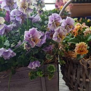 ビオラの寄せ植えカゴ🧺大小 1⃣大 フリンジビオラ・バレリーヌのチュチュ2ポット ローダンセマム・アフリカンアイズ キンギョソウ・ブロンズドラゴン エンジェルウイングスなど 2⃣小 ぶどうももか2ポット アリッサム 葉牡丹フレアホワイト シルバーレース
