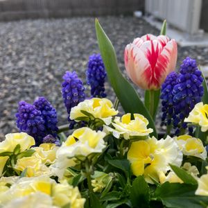 フリンジビオラの横から ムスカリ チューリップ 顔を見せています。 去年分けた球根のせいか、チューリップの背丈が意外と短く、しかも一輪しか咲きませんでした😅 みんな仲良し 家族みたい✨