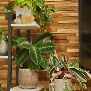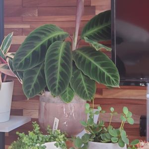 カラテア ワルセウィッチーさん ワルセヴィッチー? 朝日が1時間くらい当たる特等席✨ど真ん中の特等席✨ でも光が苦手らしく、まぶしーっ!!!ってクルクルしちゃいます😅このクルクル見たら他の子にごめん!と思いながらカーテン閉める。。。 ちなみに茶色くなった所は外のほぼ日陰管理してた時の新芽さん。 直射も少し当たってダメになったみたいー😅なので室内に移動✨ サイズ的にこののスペース入る子少なくて、綺麗だから真ん中に配置したくてこの位置なんだけど、他の子のせっかくのゴールデンタイムなのにー。と悩ましい😓