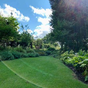 朝日の当たる庭 雨上がり 輝く庭の朝です