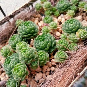 ユーザーさんからのいただきものの センペルビウム あれこれ(๓´˘`๓)♡ 中心のワイン色の子🍷ランナーから子株が でてきたのでテラコッタの大きめの鉢に 植え替えました☺周りに他の種類の 子株も植えてみました~ ←は紅茶缶に植えたもの❣色艶良くなって元気そうです💕 残り二つはリメ缶の七福神。お日様の方に向かうので、バランスが崩れてしまう😢 定期的に缶の向きをかえないと〜 これからナイスバディに戻るかな~🤣🤣