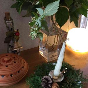 先日の雪囲いで発見した青い実のラズベリーを✂️して生けました。 🌿 においひばの葉も少し取り クリスマスの飾り付けをしてみましたが、ちょっと早いですよね😆 はたして、ラズベリーは赤くなるでしょうか?🙄