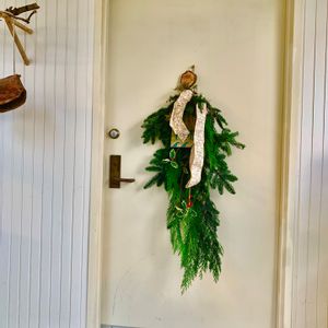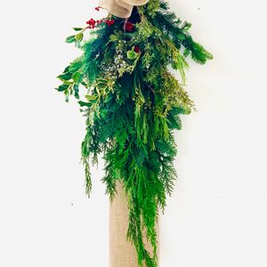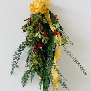 生徒さんのスワッグ: 自然になだらかな流れで ベイリーフ ホリー シダー パイン ジュニパーベリー ノーブル 麻のリボン