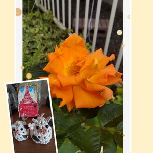 こんにちは~😄 今日は柴犬小夏さんの🏷️牛の日 ㊗️1周年なんだって✨ おめでとうございます🎊 久々にクラフトテープで出来た牛さん🐮で参加~ このオレンジ色の薔薇🌹ゴルデルゼ 去年は1輪しか咲かなかったんです😵 それで一回り大きい鉢に植え替えたら今年初夏に… 沢山の蕾付けてくれて喜んだんですが、怪我で動けず何にもお世話できなかったので、全て虫🐛食い状態で咲き、咲き終わった後も摘み取る事も出来ず悲しい思いをしていましたが… 初秋やっと綺麗に咲いてくれました🧡