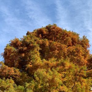 おはようございます😃 美しい山の紅葉? 違います。 小山のようなラクウショウの大木です。 やや細い円錐形のメタセコイアに比べると、こんもりとした樹形です。 紅葉もメタセコイアは黄色、ラクウショウはやや赤味があります。 ラクウショウは別名をヌマスギといい、名前の通り沼地などの水辺に育ちます。 根元が水中にあることもあるそうです。 そのために、呼吸根と呼ばれるタケノコのような根っこを周囲の地上に出していることがあります。🤔