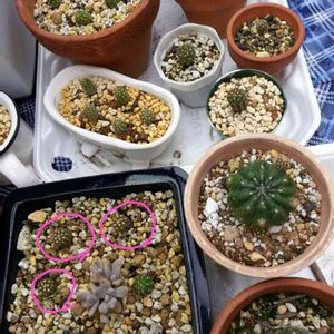 サボテン一族です。 丸の中の仔は、6日に親から放し植えました。他のは去年の仔です。他のところに4個、それが大きいので、最初にはずした仔だったのかも。
