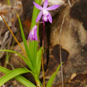 シラン(紫蘭) ラン科・シラン属 準絶滅危惧 NT そろそろカキ蘭が咲いたかなと思いとある山の中の開けた小さな沢のある所へ出掛けました…シランが沢山咲いてました。(笑) 庭先で見るシランはもっと大きくて花も多く付いているのに山の中自生のものはせいぜい25㌢と小さく🌼も多くて2つ。でも🌼の色合いがとても綺麗でした。