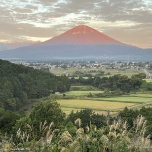 今朝の朝焼けに染まる赤富士、雲、すすき (2025.1018 5:57〜小山町足柄より)