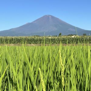 今朝の富士山と玉蜀黍畑、こしひかりの稲穂 (2025.7.29. 7:00〜御殿場市上小林より)