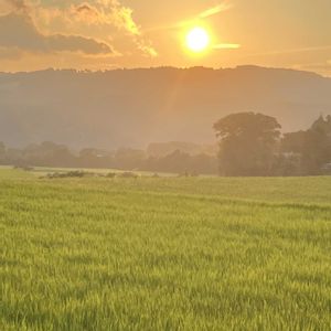 今朝の朝日と田、富士山と稲穂、雀の大群 (2025.8.4 5:23〜小山町、御殿場市より)