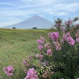 今朝の富士山と百日紅、散歩犬、川の中の棚田 (2025.8.29 6:38〜御殿場市、小山町より)