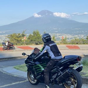 今朝の富士山とライダー,松、ゴルフ場,檜 (2025.8.31 .6:32〜小山町足柄峠中腹より) ※8月もたくさんのいいねやコメント ありがとうございました🙋♀️