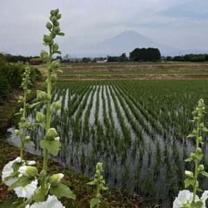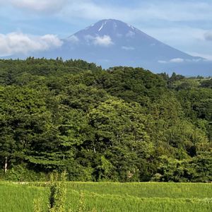 梅雨時 束の間の富士山と雲、稲の追肥する人 (2025.6.21 6:42〜小山町足柄より)