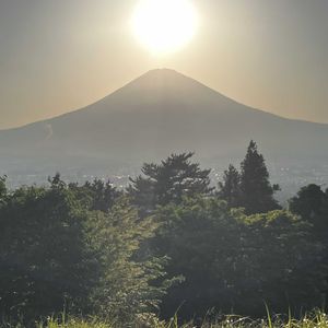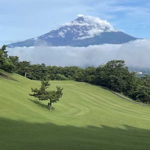 今朝の富士山と雲、ゴルフ場、芝生、松の木、 (2025.7.11 6:51〜小山町足柄峠中腹より)