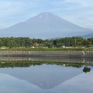 今朝の水たまりの逆さ富士、🦅、東山湖、雲 (2025.6.26 5:48〜小山町、御殿場市より)