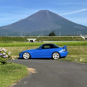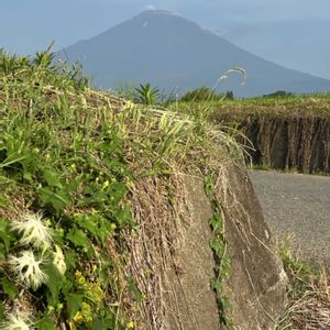 今朝の富士山と青い車、道祖神,蜻蛉,キスゲ (2025.7.19 6;29〜御殿場市より)