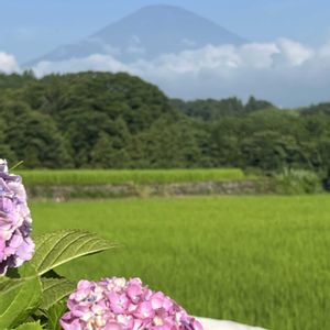 今朝の富士山,御殿場コシヒカリの田と紫陽花 (2025.7.13 7:18 小山町足柄千保より)