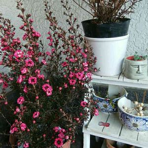 こんにちは(❁´ω`❁) 濃いピンク色の魚柳梅さんが咲いています(*ฅ́˘ฅ̀*)♡︎💕︎ 9月の台風の前に、たくさんの蕾をつけてくれていたのですが、お家の中に避難している間に、蕾が落ちてしまいました(๑•́ω•̀๑) やっと復活して咲き出しました٩(ˊᗜˋ*)و✨