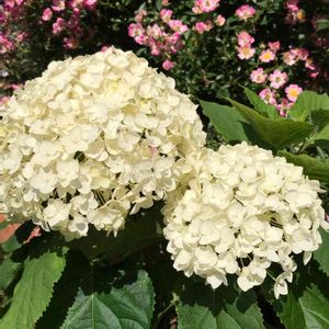 もう1鉢のアナベルは お気に入りの駐車場コーナー ヒメシャラと西洋ニンジンボクの間から ひょっこり😊