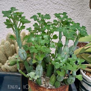 こんばんは🌙 ①個性的な形の【七宝樹】を増やしたくて置肥をしました 葉がイキイキして元気💪 ②成長がいいと一番上のポコが長細ポコになるね😆