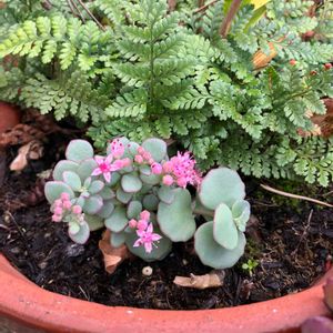 おはようございます😃 今朝は寒いです😵けど 雲ひとつない快晴です! 庭に出たら小さな子花が咲いてました! 今日はシダの日だそうで、トキワシノブと一緒にパチリ🥰