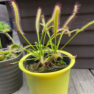 モウセンゴケ カペンシス(食虫植物) この子の為に6月を待ったと言っても過言ではない。 植物園に行くとついつい見てしまう食虫植物コーナー。 見ため的にはウツボカズラやハエトリグサの方が謎の生物感が出てるから見入ってしまうけど。 実際モウセンゴケが一番仕事すると聞いて「君に決めた!」しました。 やっぱ捕食してる所を眺めたいわけで♡ どれがいい株なのかわからないので、小バエが引っかかってるのをお迎えしました🤣 お腹すいてるのかなーって。笑