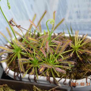 2021.03.21 8:00 外気温 12℃ ケース内温度 15℃ ケース内湿度 80% 一週間程ほったらかしにしたら、モウセンゴケが大きくなっていて、花芽も突然伸びていた。