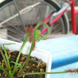 3日に投稿した花の足元です。 細く長く伸びてるのは花茎です。 このキレイな粘液で虫を捕まえるね。