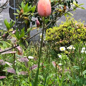 去年のチューリップの球根が🌷 たまたまこぼれたらしく 1人だけで咲きました。 可愛い色💕