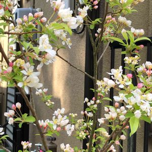 お散歩コースのご近所の玄関横に 咲いていました。 蕾はピンクで、花が開くと白っぽく見えます。 葉っぱのつき方も特徴的。 なんのお花かしら。 どなたか教えて頂けませんか。(✿︎´ ꒳ ` )♡︎