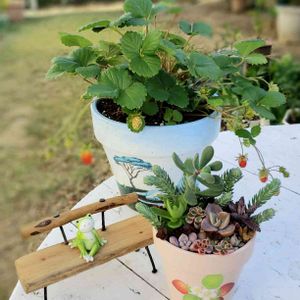 今日は15日。 🏷️毎月15日はいちごの日 に参加します。😄🎶 ㊗️2周年❗🎊🎉🎊🙌 四季なりの赤花いちご。💗 かわいい実がなっています。🍓 いちごのリメ鉢の多肉寄せ植えを添えて。✨ カエル🐸ちゃん、広いベンチに1人で座っていて、誰かを待っているのかな? 昨日は、リアル🐸ちゃんがいたけど、今日も出てきてくれるかな?😃🎶 頑張ろう❗日本‼️ 👊✨