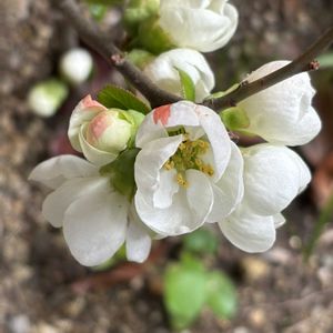 2日前に投稿したボケのお花が今朝は咲いていました 白に少しピンクが入ってる 生クリームの白さのようです 2枚目は昨日のいちごパフェ🍓 3枚目は久しぶりに食べたオープンサンド。ハム、ソーセージが美味しい😋 オシャレなお店が並ぶ街 お菓子屋さんの店先の寄植えもオシャレ〜