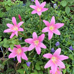 YS散歩🍀 ラーメン屋🍜さんの入り口に♡ 雨が☁️☔降ったり止んだりの一日でした。昨日も💦 ゼラフィランサス・ロゼア🌸 別名・コサフランモドキ ヒガンバナ科 タマスダレ属 【紙子着て濡るとも折らん雨の花】松尾芭蕉